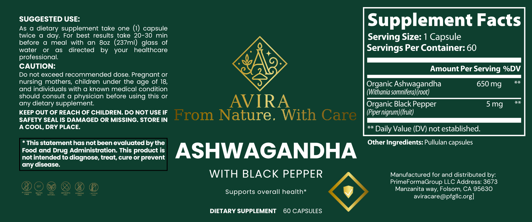 Ingredients: Organic Ashwagandha (Withania somnifera)(root), Organic Black Pepper (Piper nigrum)(fruit), pullulan capsules.