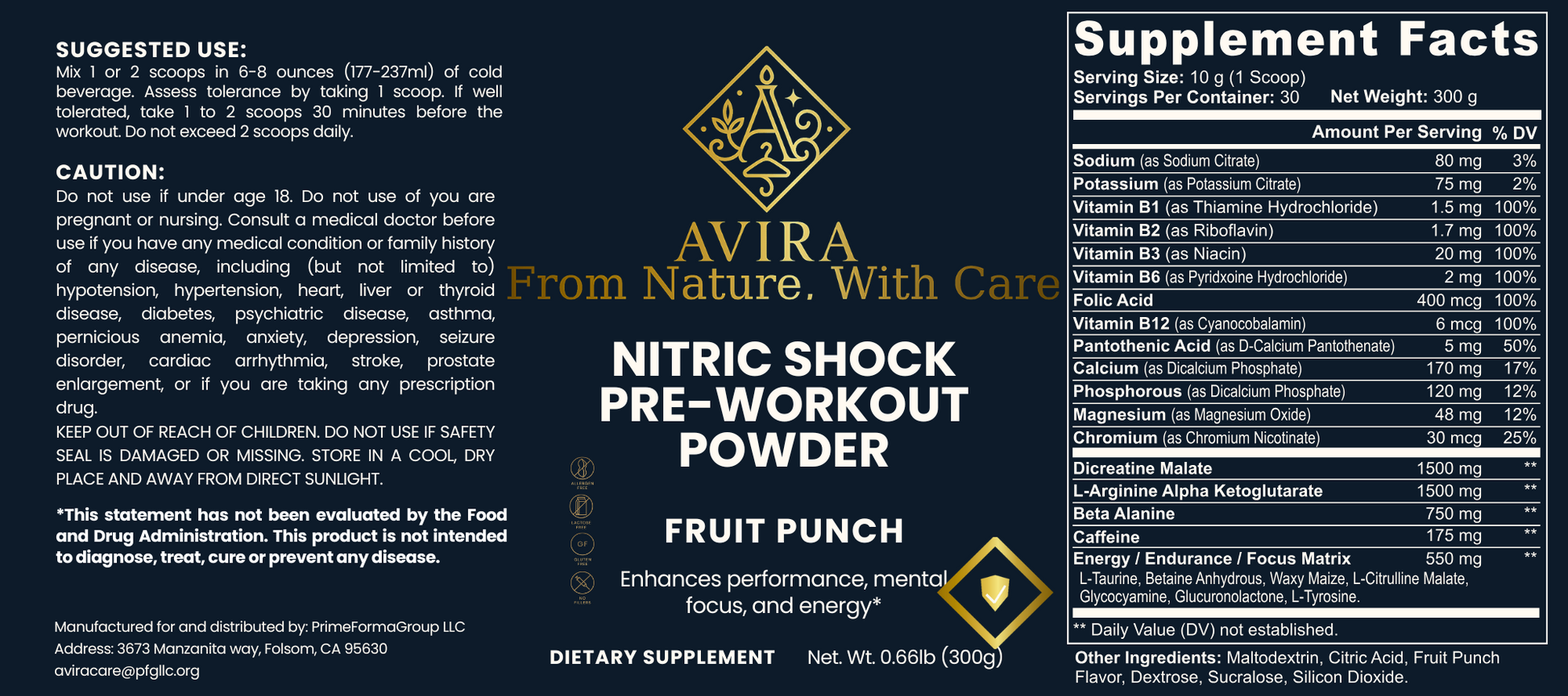 Ingredients: Sodium (as Sodium Citrate), Potassium (as Potassium Citrate), Vitamin B1 (as Thiamine Hydrochloride), Vitamin B2 (as Riboflavin), Vitamin B3 (as Niacin), Vitamin B6 (as Pyridoxine Hydrochloride), Folic Acid, Vitamin B12 (as Cyanocobalamin), Pantothenic Acid (as D-Calcium Pantothenate), Calcium (as Dicalcium Phosphate), Phosphorous (as Dicalcium Phosphate), Magnesium (as Magnesium Oxide), Chromium (as Chromium Nicotinate), Dicreatine Malate, L-Arginine Alpha Ketoglutarate, Beta Alanine, Caffeine, Energy/Endurance/Focus Matrix (L-Taurine, Betaine Anhydrous, Waxy Maize, L-Citrulline Malate, Glycocyamine, Glucuronolactone, L-Tyrosine, Maltodextrin, Citric Acid, Fruit Punch Flavor, Dextrose, Sucralose, Silicon Dioxide.